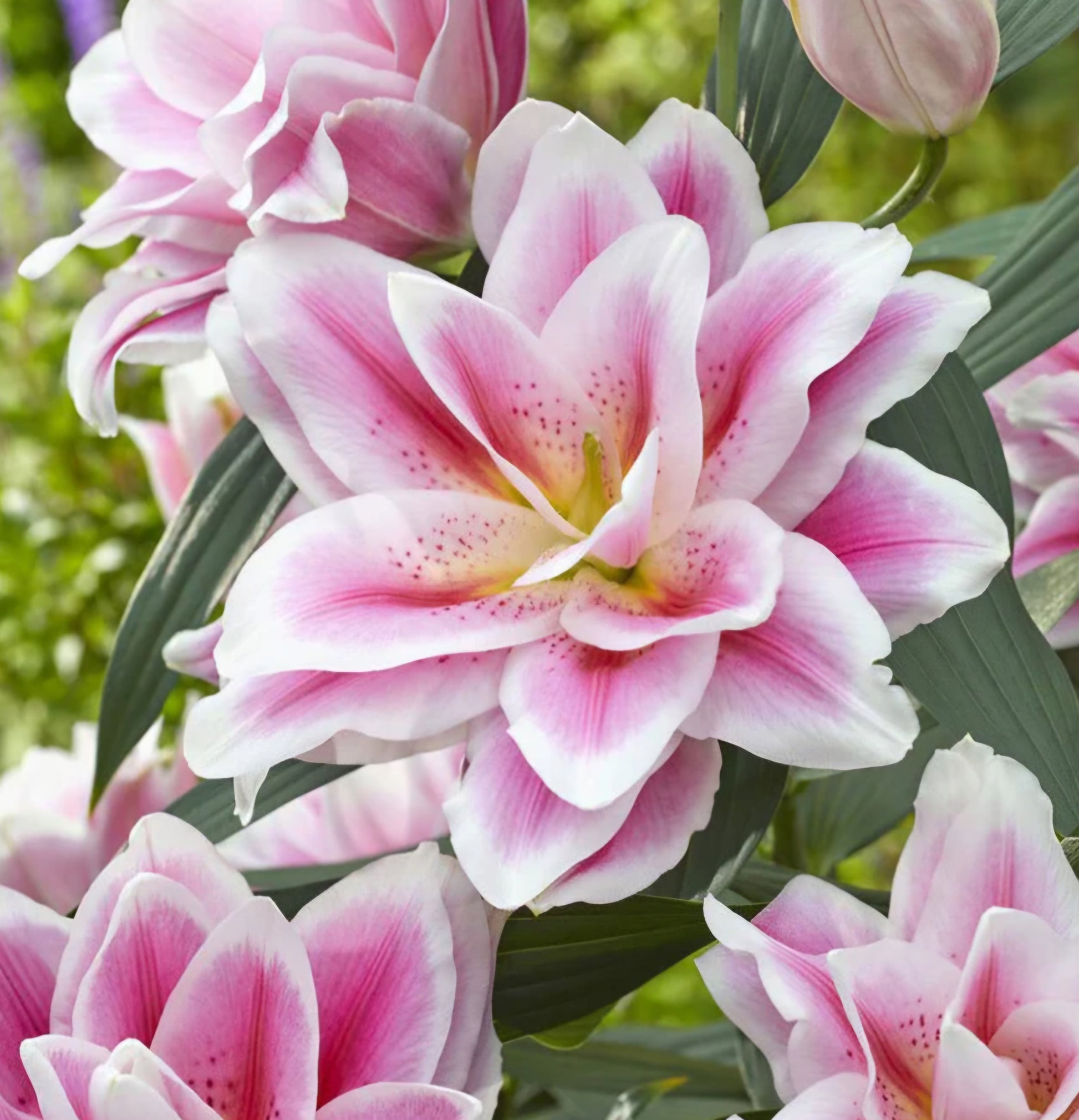 Yields plenty of lush, 6" flowers that can be enjoyed in lightly scented bouquets. Perfectly shaped, pink blooms are flecked with magenta and edged in light pink to white. Roselilies are double-flowered Oriental lilies with a bloom form reminiscent of roses. They produce no pollen, so they can be enjoyed without triggering allergies, staining clothes or discolouring furniture. Brightens and beautifies midsummer borders and feature beds. Perennializes well, so leave the bulbs undisturbed.Lilium oriental