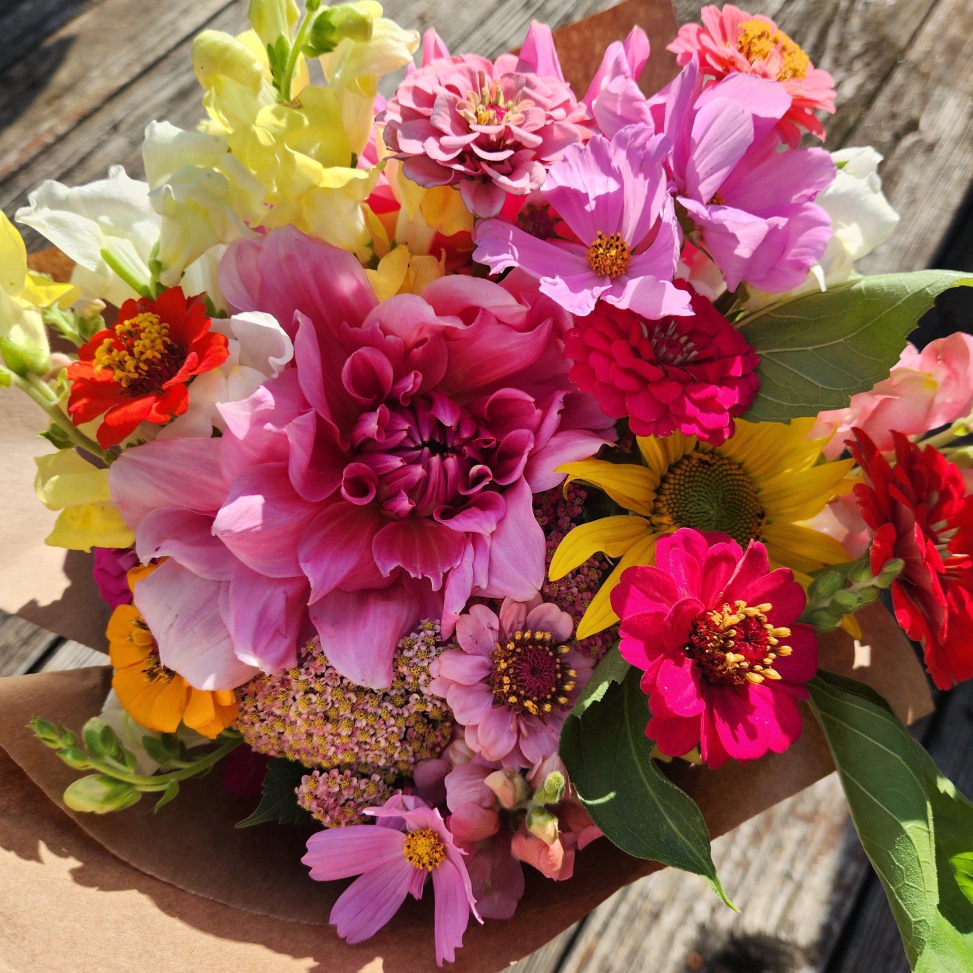 Designers choice market bouquet includes a variety of specialty flowers. May include: Dahlias, Zinnias, sunflowers, snapdragons, lisiathus, phlox, Cosmos, strawflower and more!